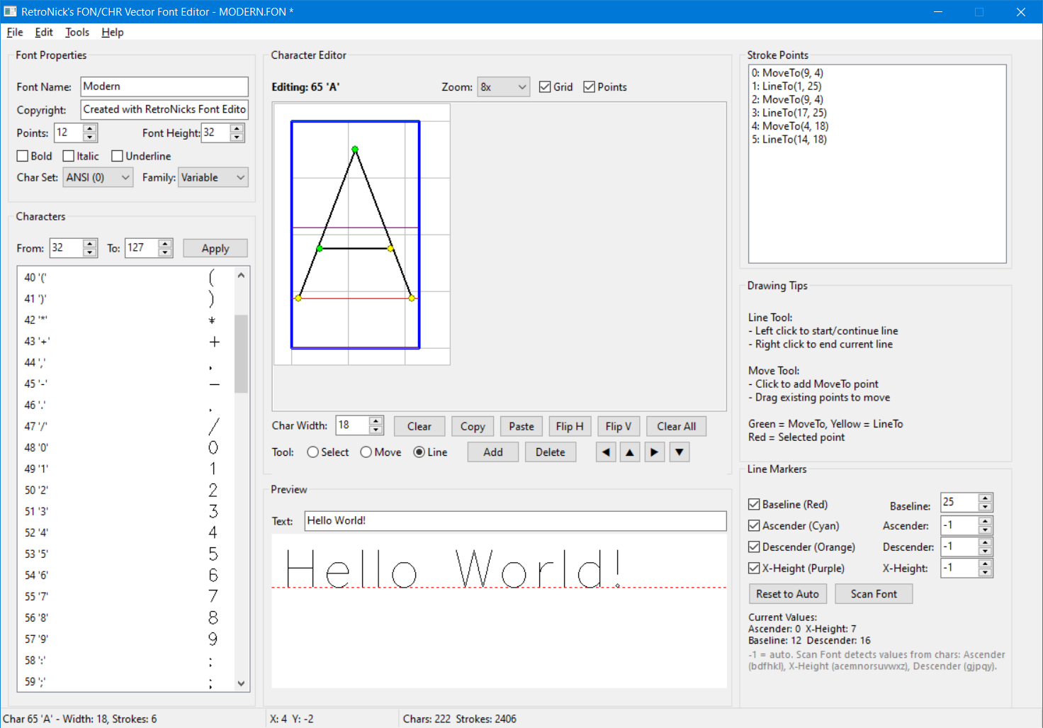 This Vector Font Editor supports Microsoft FON vector format and Borland CHR format. Check out my Bitmap Font Editor for Bitmap FON and FNT (rom fonts) formats.